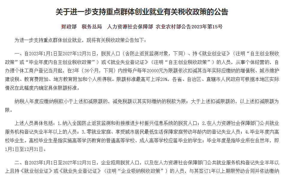 关于进一步支持重点群体创业就业有关税收政策的公告